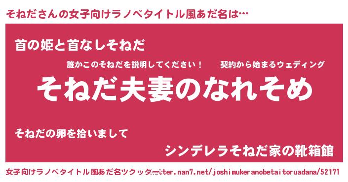 | 男性向けラノベタイトル風あだ名 | 『おまえをオタクにしてやるから、俺をそねだにしてくれ! 』 |
