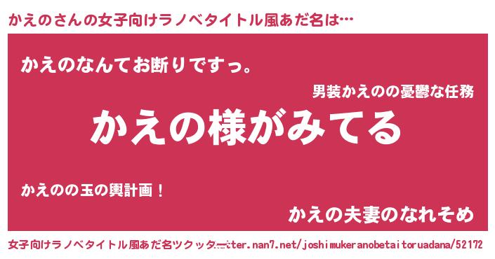 かえのさんの女子向けラノベタイトル風あだ名は… 『かえの様がみてる』『かえのなんてお断りですっ。』『かえの夫妻のなれそめ』 ツクッター #女子向けラノベタイトル風あだ名ツクッター http://tkutter.nan7.net/joshimukeranobetaitoruadana/52172/