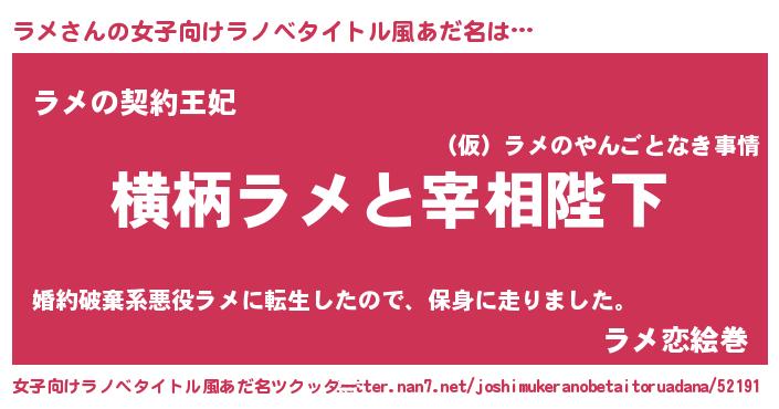 | 男性向けラノベタイトル風あだ名 | 『ラメに滅ぼされるだけの簡単なお仕事です』 |