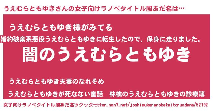 | 男性向けラノベタイトル風あだ名 | 『Re:うえむらともゆきから始める異世界生活』 |