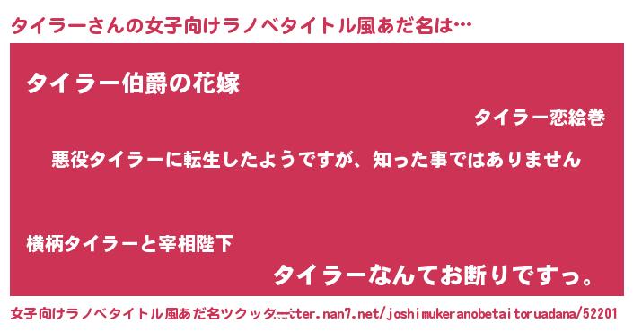 | 男性向けラノベタイトル風あだ名 | 『この素晴らしい世界にタイラーを!』 |