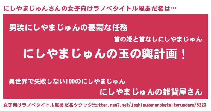 | 男性向けラノベタイトル風あだ名 | 『にしやまじゅん~年齢イコール彼女いない歴の魔法使い~』 |