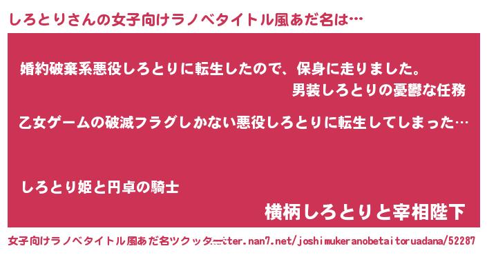| 男性向けラノベタイトル風あだ名 | 『この素晴らしい世界にしろとりを!』 |