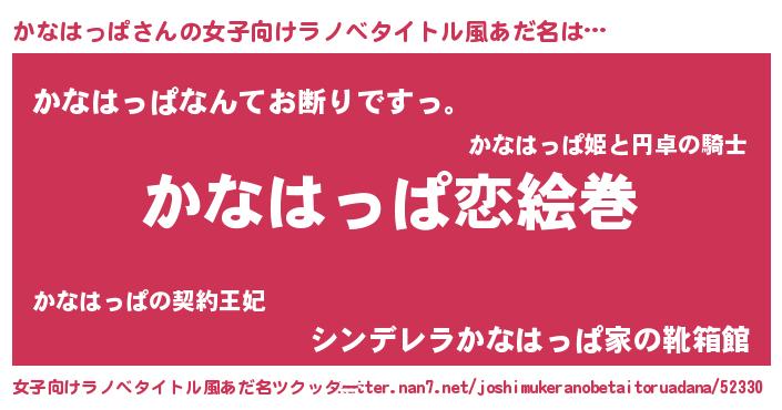 | 男性向けラノベタイトル風あだ名 | 『おまえをオタクにしてやるから、俺をかなはっぱにしてくれ! 』 |