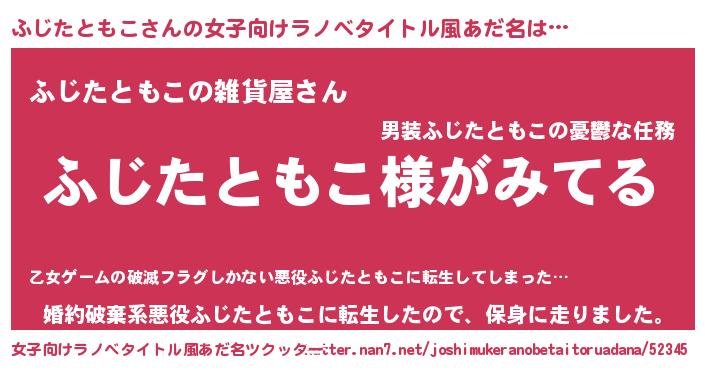 | 男性向けラノベタイトル風あだ名 | 『ふじたともこの嫁は女の子じゃないと思った?』 |