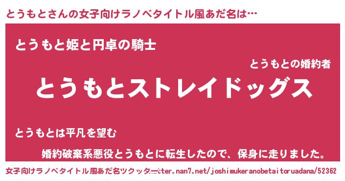 | 男性向けラノベタイトル風あだ名 | 『Re:とうもとから始める異世界生活』 |