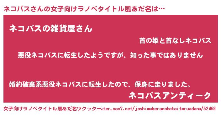 | 男性向けラノベタイトル風あだ名 | 『この素晴らしい世界にネコバスを!』 |