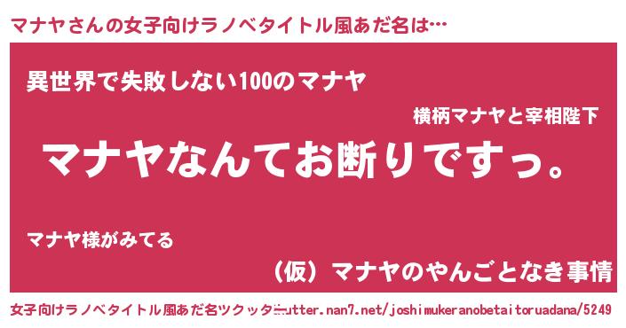 | 男性向けラノベタイトル風あだ名 | 『魔法科高校のマナヤ』『マナヤの憂鬱』 |