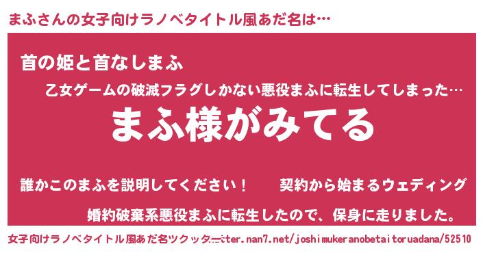 | 男性向けラノベタイトル風あだ名 | 『まふの嫁は女の子じゃないと思った?』 |
