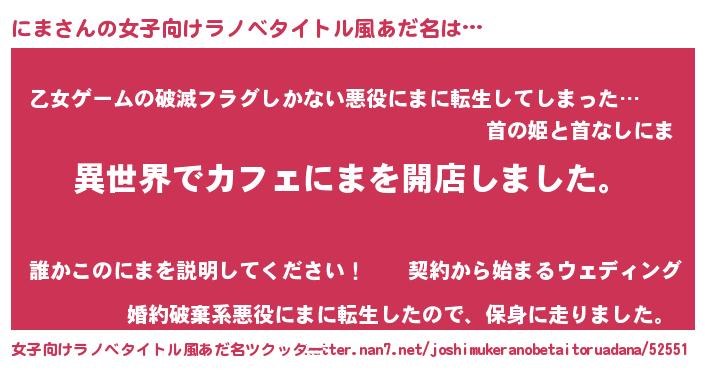 | 男性向けラノベタイトル風あだ名 | 『誰もが恐れるあのにまが、ぼくの専属メイドになるようです。』 |
