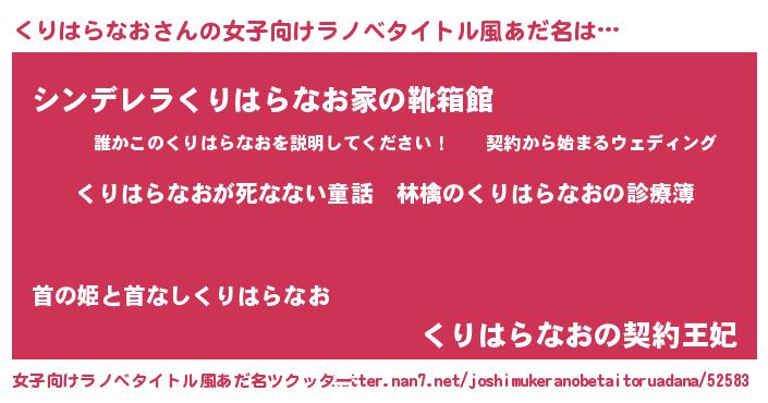 くりはらなおさんの女子向けラノベタイトル風あだ名は… 『くりはらなおが死なない童話 林檎のくりはらなおの診療簿』『シンデレラくりはらなお家の靴箱館』『くりはらなおの契約王妃』 ツクッター #女子向けラノベタイトル風あだ名ツクッター http://tkutter.nan7.net/joshimukeranobetaitoruadana/52583/