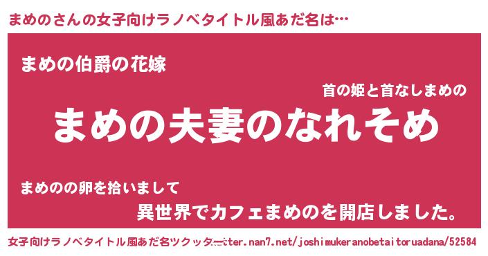 | 男性向けラノベタイトル風あだ名 | 『おまえをオタクにしてやるから、俺をまめのにしてくれ! 』 |