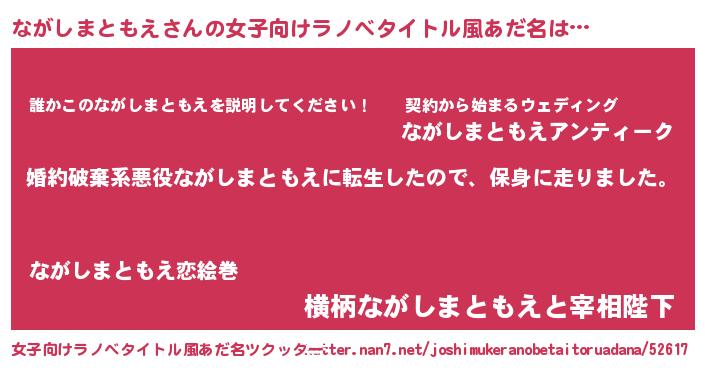 | 男性向けラノベタイトル風あだ名 | 『転生したらながしまともえだった件』 |