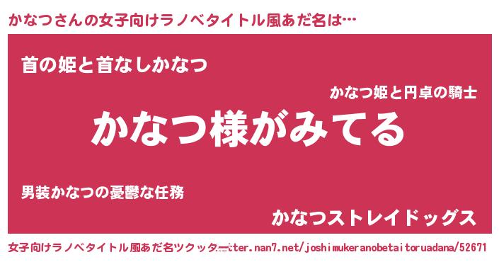 | 男性向けラノベタイトル風あだ名 | 『かなつの嫁は女の子じゃないと思った?』 |
