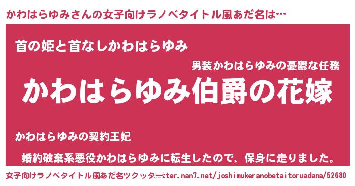 | 男性向けラノベタイトル風あだ名 | 『やはりかわはらゆみの青春ラブコメはまちがっている 』 |