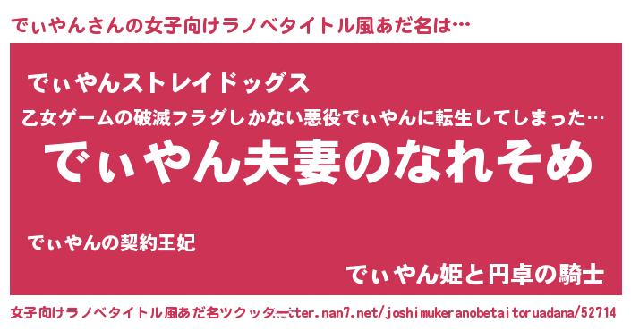 | 男性向けラノベタイトル風あだ名 | 『おまえをオタクにしてやるから、俺をでぃやんにしてくれ! 』 |