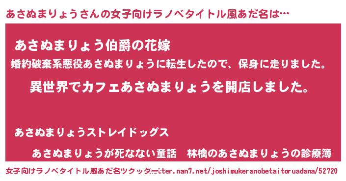| 男性向けラノベタイトル風あだ名 | 『誰もが恐れるあのあさぬまりょうが、ぼくの専属メイドになるようです。』 |