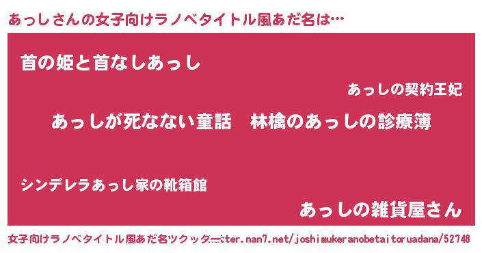 | 男性向けラノベタイトル風あだ名 | 『魔弾の王とあっし』 |