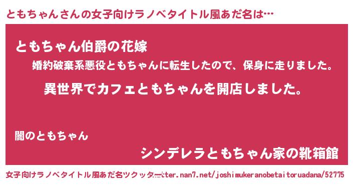 | 男性向けラノベタイトル風あだ名 | 『誰もが恐れるあのともちゃんが、ぼくの専属メイドになるようです。』 |