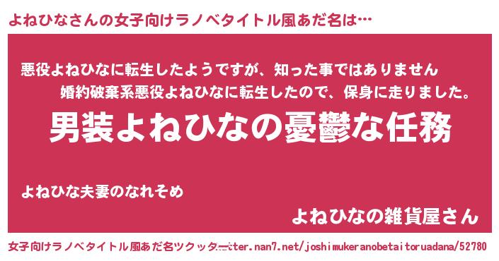 | 男性向けラノベタイトル風あだ名 | 『うちのよねひなが世界を掌握している!』 |