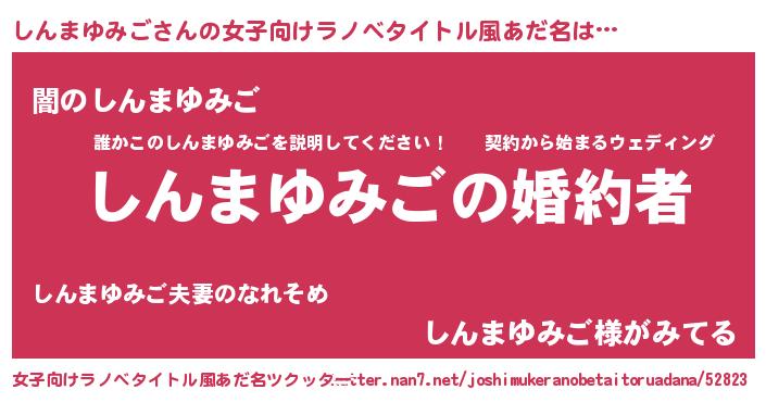 しんまゆみごさんの女子向けラノベタイトル風あだ名は… 『しんまゆみごの婚約者』『闇のしんまゆみご』『しんまゆみご様がみてる』 ツクッター #女子向けラノベタイトル風あだ名ツクッター http://tkutter.nan7.net/joshimukeranobetaitoruadana/52823/
