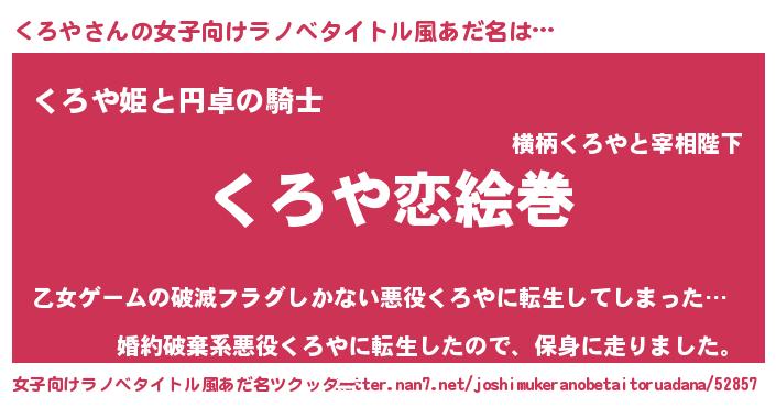 | 男性向けラノベタイトル風あだ名 | 『おまえをオタクにしてやるから、俺をくろやにしてくれ! 』 |