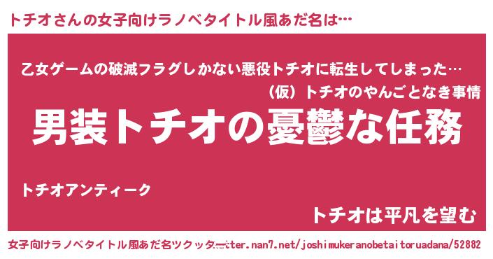 | 男性向けラノベタイトル風あだ名 | 『うちのトチオが世界を掌握している!』 |