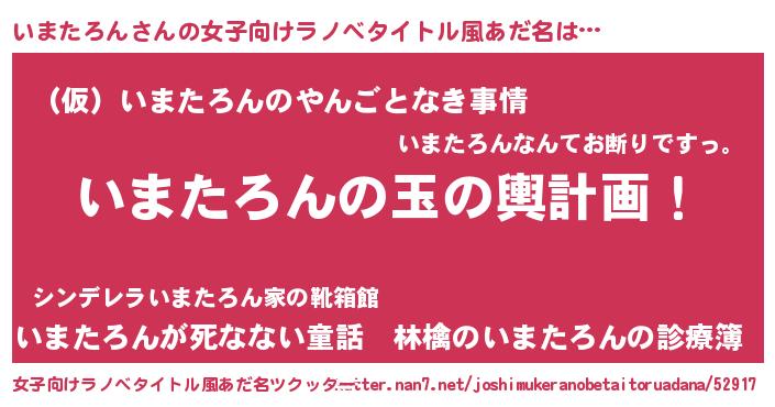 | 男性向けラノベタイトル風あだ名 | 『いまたろん~年齢イコール彼女いない歴の魔法使い~』 |