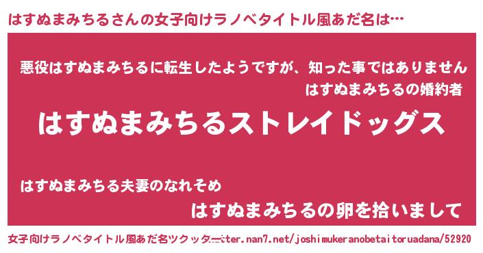 | 男性向けラノベタイトル風あだ名 | 『Re:はすぬまみちるから始める異世界生活』 |