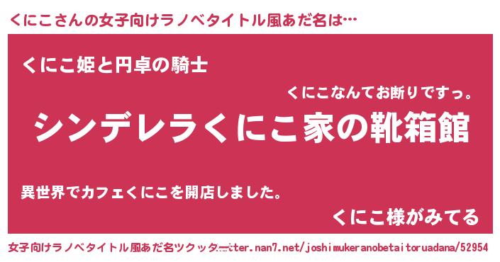 くにこさんの女子向けラノベタイトル風あだ名は… 『シンデレラくにこ家の靴箱館』『くにこ姫と円卓の騎士』『くにこ様がみてる』 ツクッター #女子向けラノベタイトル風あだ名ツクッター http://tkutter.nan7.net/joshimukeranobetaitoruadana/52954/