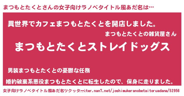 | 男性向けラノベタイトル風あだ名 | 『Re:まつもとたくとから始める異世界生活』 |