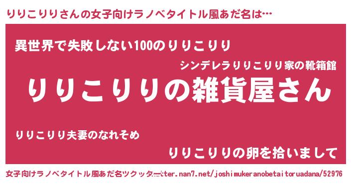 りりこりりさんの女子向けラノベタイトル風あだ名は… 『りりこりりの雑貨屋さん』『異世界で失敗しない100のりりこりり』『りりこりりの卵を拾いまして』 ツクッター #女子向けラノベタイトル風あだ名ツクッター http://tkutter.nan7.net/joshimukeranobetaitoruadana/52976/