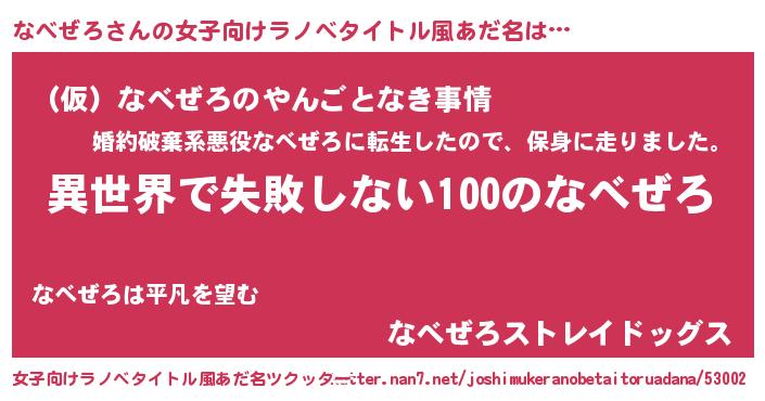 | 男性向けラノベタイトル風あだ名 | 『なべぜろという概念が存在しない退屈な世界 』 |