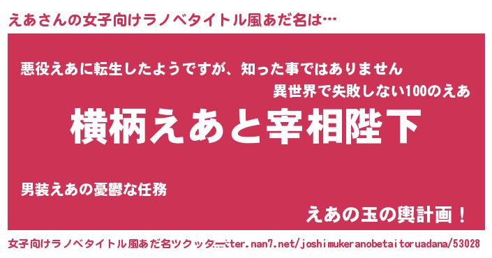 えあさんの女子向けラノベタイトル風あだ名は… 『横柄えあと宰相陛下』『悪役えあに転生したようですが、知った事ではありません』『えあの玉の輿計画!』 ツクッター #女子向けラノベタイトル風あだ名ツクッター http://tkutter.nan7.net/joshimukeranobetaitoruadana/53028/
