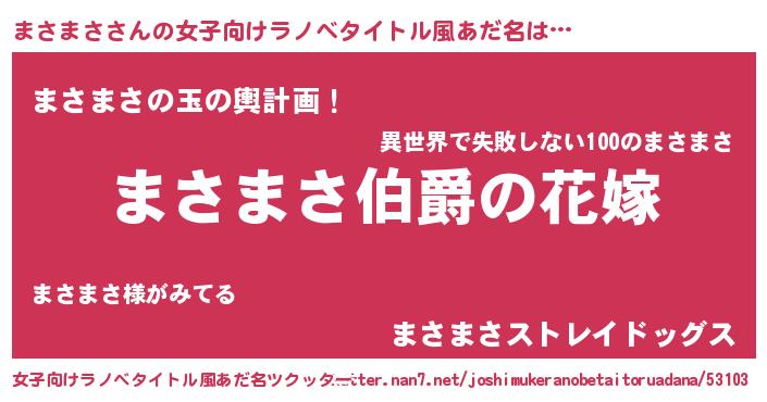 | 男性向けラノベタイトル風あだ名 | 『うちの娘の為ならば、俺はもしかしたらまさまさも倒せるかもしれない。』 |