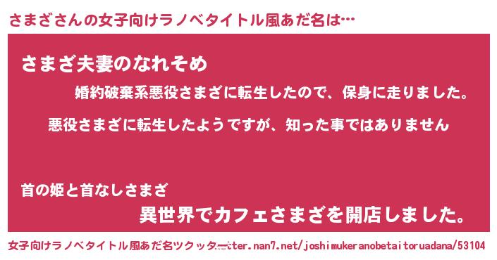 | 男性向けラノベタイトル風あだ名 | 『この素晴らしい世界にさまざを!』 |