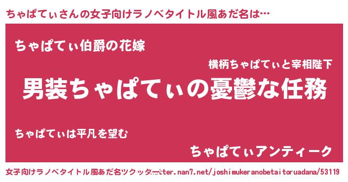 | 男性向けラノベタイトル風あだ名 | 『うちのちゃぱてぃが世界を掌握している!』 |