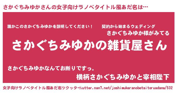 | 男性向けラノベタイトル風あだ名 | 『やはりさかぐちみゆかの青春ラブコメはまちがっている 』 |