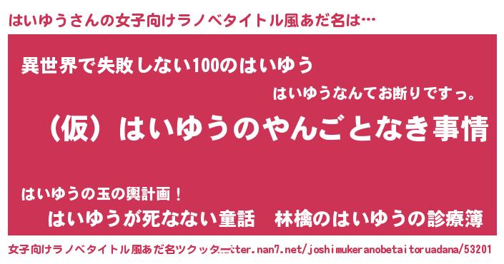 | 男性向けラノベタイトル風あだ名 | 『はいゆうの憂鬱』『魔弾の王とはいゆう』 |