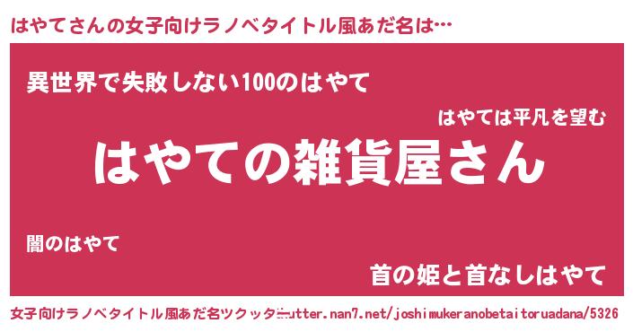 | 男性向けラノベタイトル風あだ名 | 『やはりはやての青春ラブコメはまちがっている 』 |