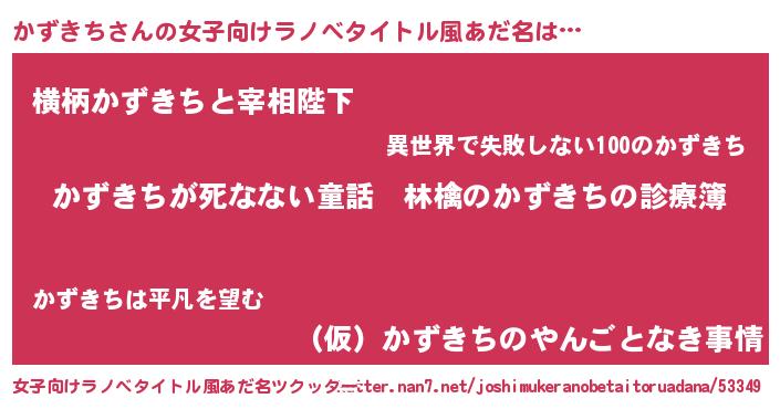 かずきちさんの女子向けラノベタイトル風あだ名は… 『かずきちが死なない童話 林檎のかずきちの診療簿』『横柄かずきちと宰相陛下』『(仮)かずきちのやんごとなき事情』 ツクッター #女子向けラノベタイトル風あだ名ツクッター http://tkutter.nan7.net/joshimukeranobetaitoruadana/53349/