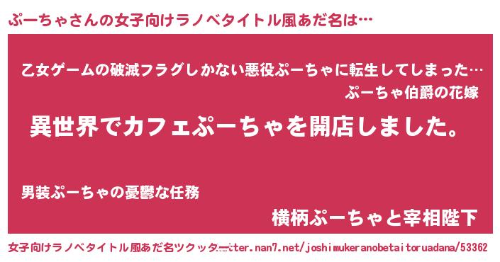 | 男性向けラノベタイトル風あだ名 | 『誰もが恐れるあのぷーちゃが、ぼくの専属メイドになるようです。』 |