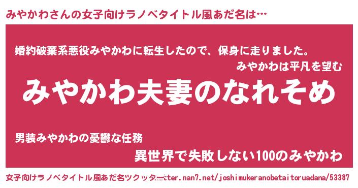 | 男性向けラノベタイトル風あだ名 | 『おまえをオタクにしてやるから、俺をみやかわにしてくれ! 』 |