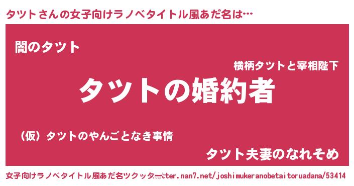 | 男性向けラノベタイトル風あだ名 | 『うちの娘の為ならば、俺はもしかしたらタツトも倒せるかもしれない。』 |