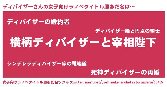 ディバイザーさんの女子向けラノベタイトル風あだ名は… 『横柄ディバイザーと宰相陛下』『ディバイザーの婚約者』『死神ディバイザーの再婚』 ツクッター #女子向けラノベタイトル風あだ名ツクッター http://tkutter.nan7.net/joshimukeranobetaitoruadana/53465/