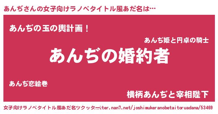あんぢさんの女子向けラノベタイトル風あだ名は… 『あんぢの婚約者』『あんぢの玉の輿計画!』『横柄あんぢと宰相陛下』 ツクッター #女子向けラノベタイトル風あだ名ツクッター http://tkutter.nan7.net/joshimukeranobetaitoruadana/53469/
