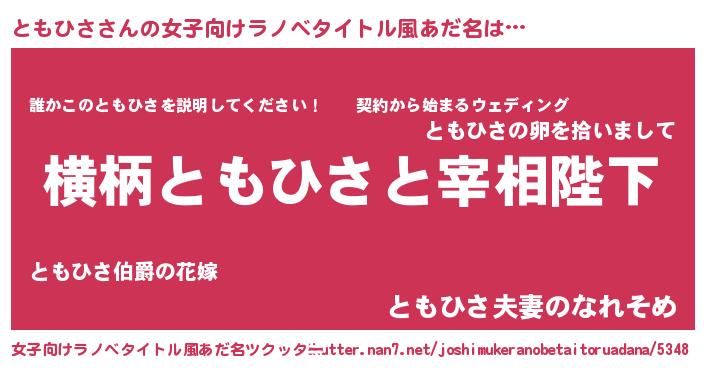 | 男性向けラノベタイトル風あだ名 | 『ともひさに滅ぼされるだけの簡単なお仕事です』 |