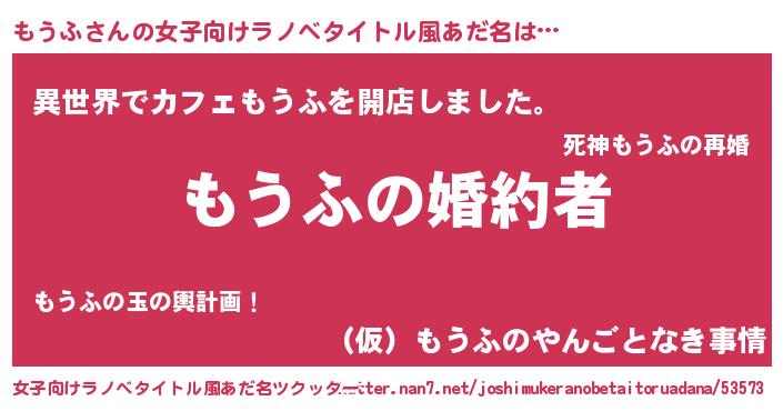 | 男性向けラノベタイトル風あだ名 | 『うちの娘の為ならば、俺はもしかしたらもうふも倒せるかもしれない。』 |