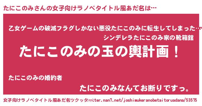 | 男性向けラノベタイトル風あだ名 | 『たにこのみ~年齢イコール彼女いない歴の魔法使い~』 |