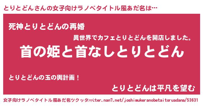 とりとどんさんの女子向けラノベタイトル風あだ名は… 『首の姫と首なしとりとどん』『死神とりとどんの再婚』『とりとどんは平凡を望む』 ツクッター #女子向けラノベタイトル風あだ名ツクッター http://tkutter.nan7.net/joshimukeranobetaitoruadana/53631/